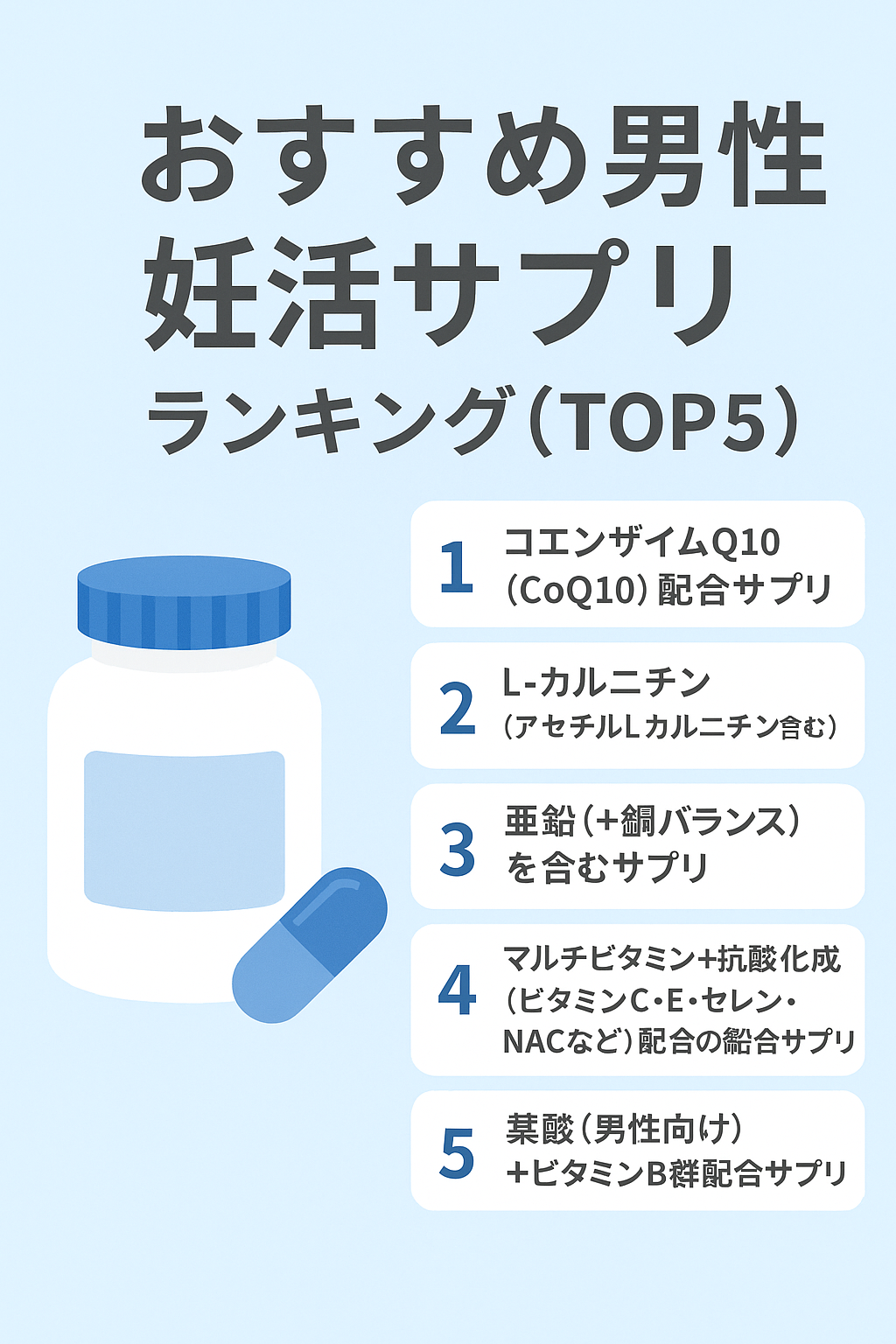 オススメネタ✨✨ 男性向け 妊活サプリ おすすめランキング(TOP5) おすすめ男性妊活サプリランキング(TOP5) — です。各サプリの「推し成分」「期待できる効果」「目安量」「注意点」です! 2025.10.16 オススメネタ✨✨